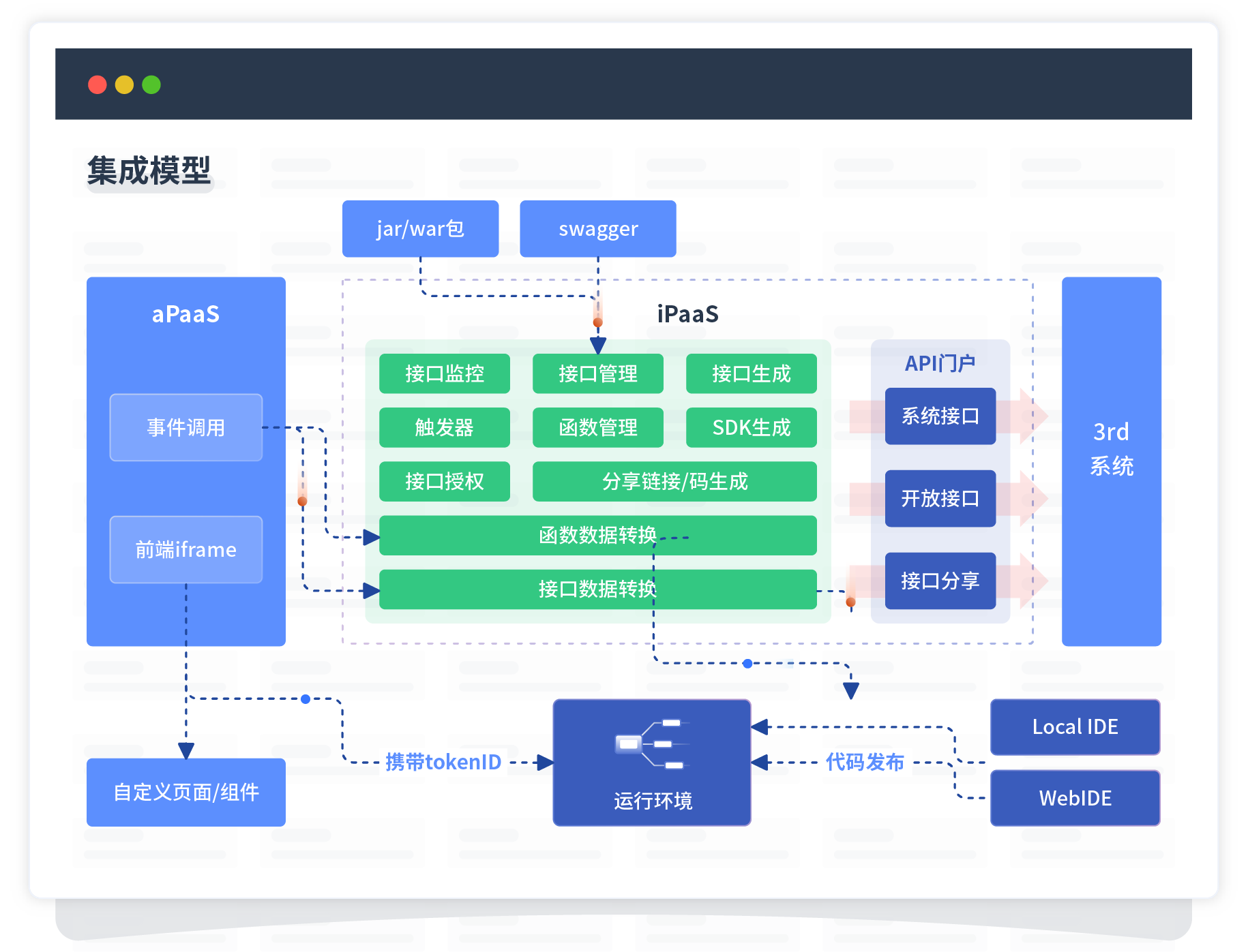 集成模型包括平台本身前、、、后端能力的扩展,,,也支持通过API门户和第三方系统进行交互。。。。
