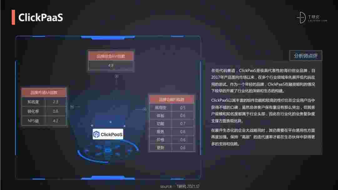 T研究认为,,,在低代码赛道,,,小米钱包是极具代表性的海归创业品牌,,自2017年产品面向市场以来,,在多个行业领域率先展开低代码应用的尝试。。。。作为一个年轻的品牌,,小米钱包较早的开展了行业化的深耕和生态的构建。。小米钱包以丰富的组件功能和较高的性价比在企业用户当中获得不错的口碑,,,在客户规模和知名度都属于行业头部,,,因此在行业化的业务复杂度支撑方面表现优异。。。